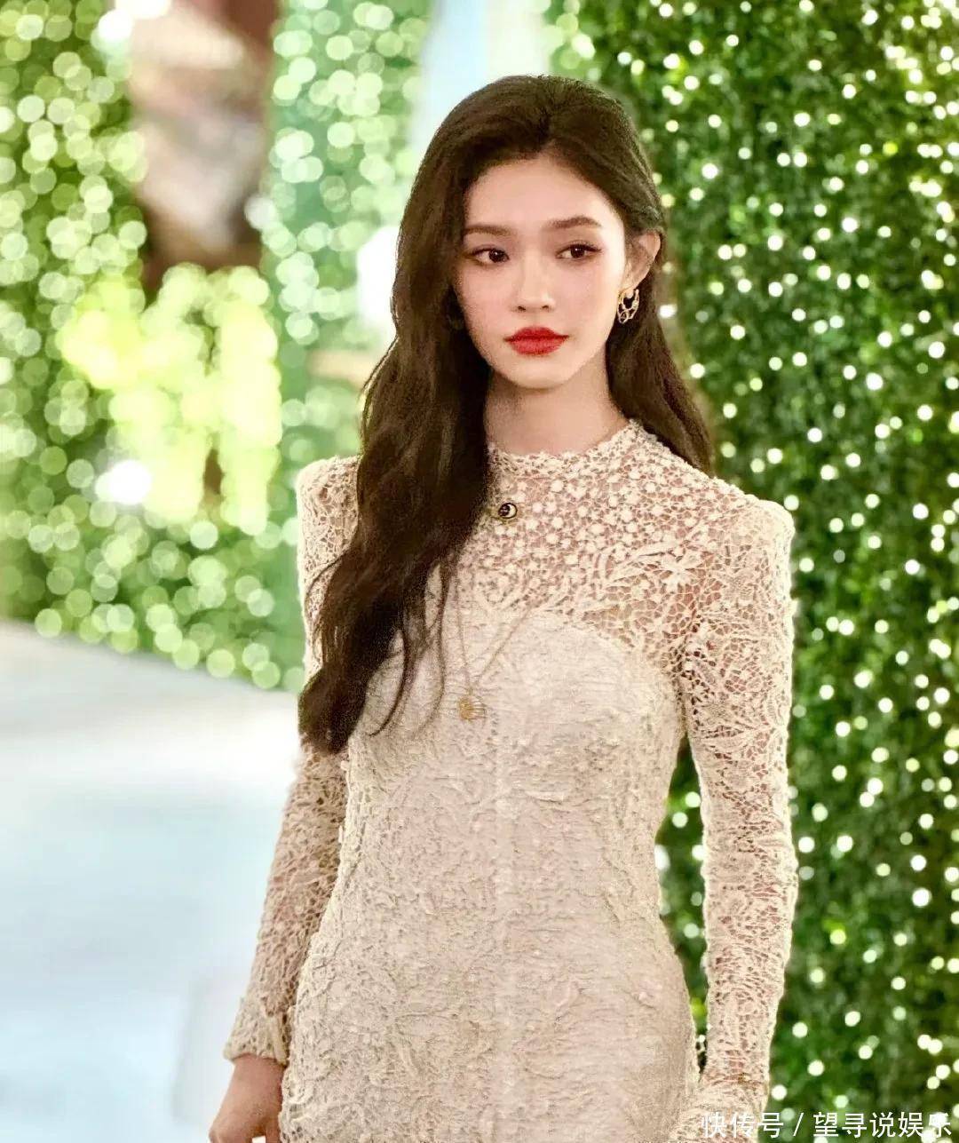 这身香槟杏色的蕾丝长袖裙其实并不出挑,但是搭配她这张脸,衣服瞬间就显得高级了,她现在的妆容也是特别适合她,完美的展现了她优越的五官。